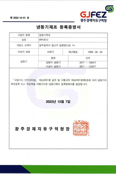 냉동기제조 등록증명서